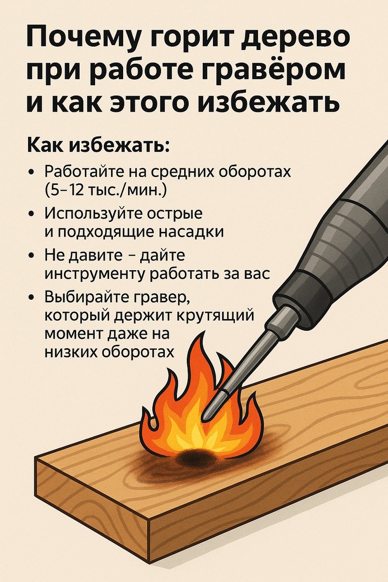Почему горит дерево при работе гравёром и как этого избежать 🔥🌳 При резьбе по дереву многие сталкивались с тем, что поверхность начинает темнеть, а иногда и подгорать. Почему так происходит? Основные причины: Слишком высокие обороты → древесина не режется, а обугливается. Слабый инструмент теряет мощность на низах и перегревает заготовку. Неправильная насадка или чрезмерное давление. Как избежать: Работайте на средних оборотах (5–12 тыс./мин.) — этого достаточно для чистого реза. Используйте острые и подходящие насадки. Не давите — дайте инструменту работать за вас. Выбирайте гравер, который держит крутящий момент даже на низких оборотах. 👉 В граверах Tornadotool мотор стабильно работает с 5000 об/мин, поэтому дерево обрабатывается без перегрева и обугливания.