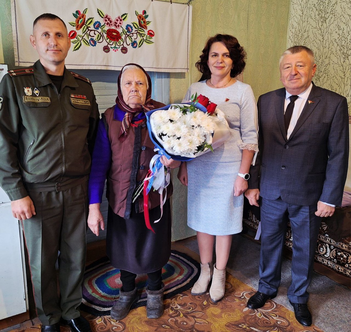 🔵Мороз, военный комиссар Столинского района Сергей Потрубейко. Гости пожелали 89-летней Анне Адамовне здоровья, благополучия, всех замных благ, вручили цветы и подарок.