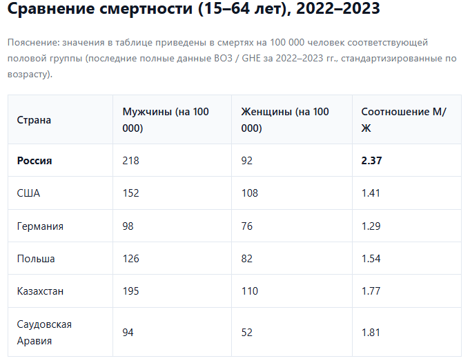 Эти данные подчеркивают аномально высокую смертность среди российских мужчин трудоспособного возраста по сравнению с развитыми странами.