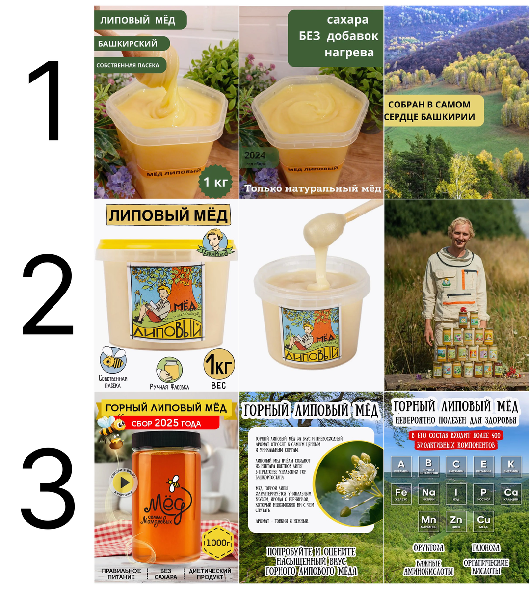 В чем еще проблема карточек - их делают люди, которые мало связаны с пасекой. Поэтому и много ИИ, пчел и даже медведей на карточках, но очень мало конкретики. Меня, например, ни одно фото не убедило, что показана настоящая текстура. Поэтому я сразу зацепилась за карточку 3 - там конкретики больше всего. Тонкий изящный аромат из карточки 1 - общие слова. Мед горной липы и вкус с горчинкой - это уже конкретика. Эффективно борется с простудой и снижает холестерин у 1 - снова ни о чем. А 400 компонентов и 13 элементов таблицы Меделеева - уже что-то. Фразы типа "Мы возим пчел только на те поля..." больше ни у кого нет, действительно как будто куда-то возят пчел, а не просто картинки размещают. И так во всем.