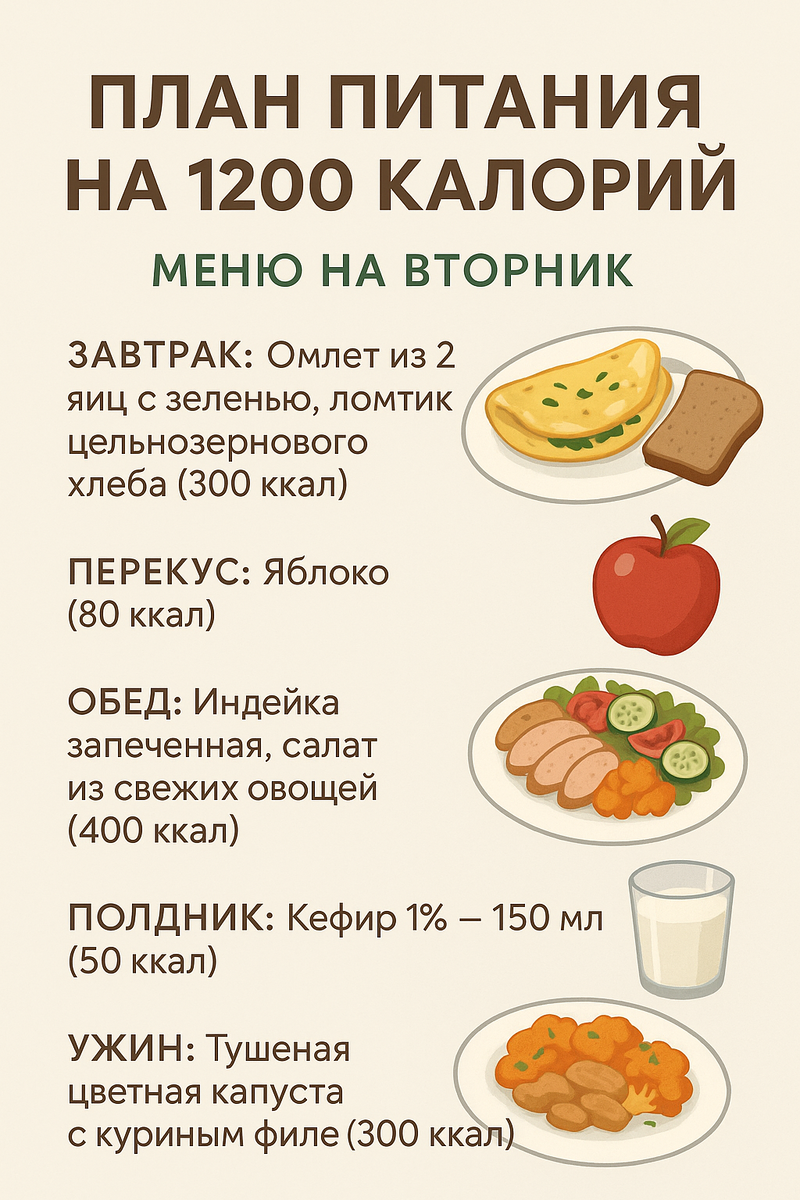 😱😱😱 ВОТ ПЛАН!! Низкокалорийный рацион на 1200 ккал для похудения. Структура: 5 приемов пищи. · Белок: основа рациона (яйца, индейка, курица, кефир) для сытости. · Углеводы: цельнозерновой хлеб и яблоко. · Клетчатка: овощи в обед и ужин. · Цель: снижение веса за счет дефицита калорий при сохранении сытости. Вот по такому я и похудел, Всем советую!!!