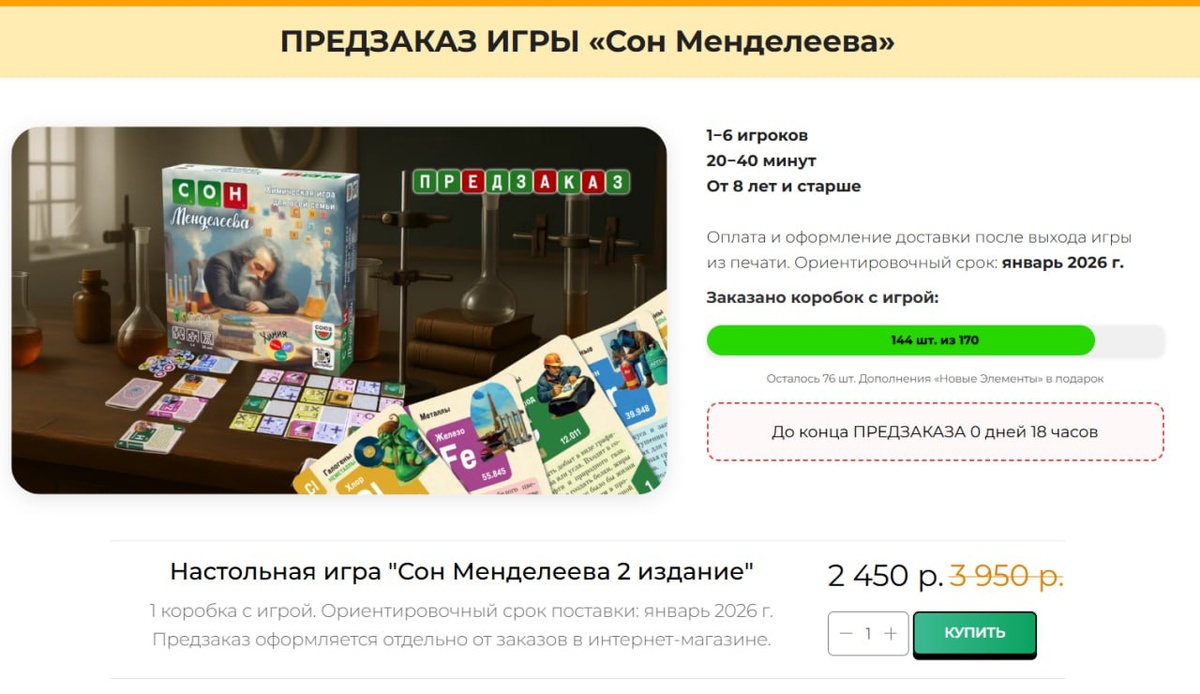 18 часов до окончания предзаказа на второе издание настольной игры по химии "Сон Менделеева"