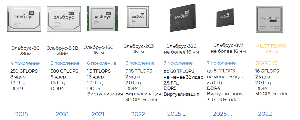- Эльбрус-8v7 (2024) — до 8 TFLOPS, 2.5 ГГц, ≥6 ядер, ≤16 нм.