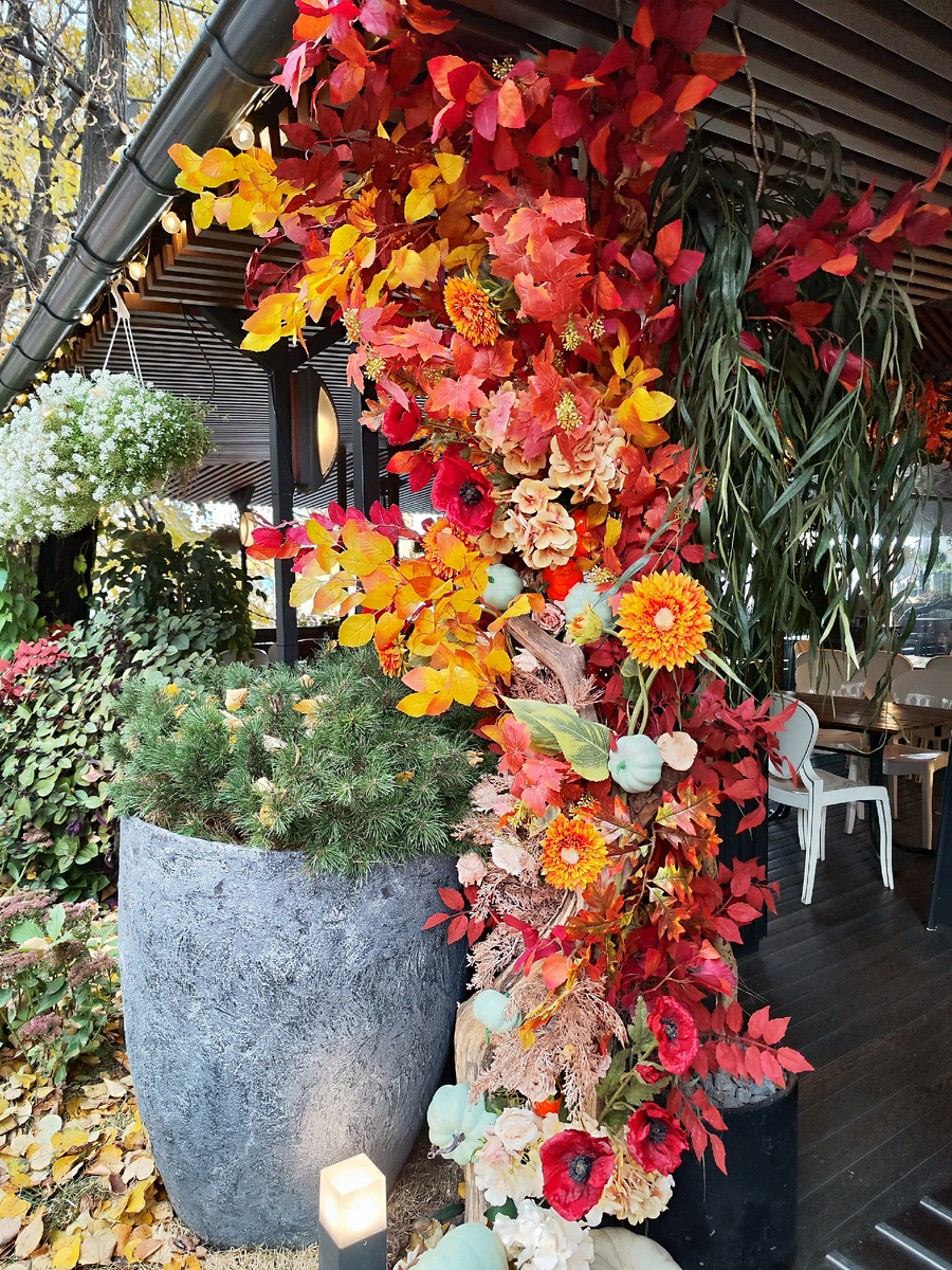 Нам хотелось места с характером и видом. «Шатёр» буквально стоит над водой — это заметно сразу: из больших окон открывается живописная перспектива Чистых прудов, а сам зал оформлен как уютный шатёр с тёплым освещением и этническими лампами. Атмосфера балансирует между праздничной и камерной — идеально для свидания или встречи с друзьями. Начнем с входной зоны. Она у них всегда украшена. Сейчас осень и вход в тыквах, ярких листьях. Предлагаю посмотреть фотографии ниже (фотографии автора статьи). Сквозь листву можно посмотреть и столики на веранде. Ниже мы видим, что и веранда украшена. Сидеть здесь уже прохладно , несмотря на то, что и пледы есть, и под крышей и даже лёгкие стены имеются. Веранда Заходим, оставляем одежду в гардеробе, который находится на входе и проходим в шатер. По пути видим оформленную интересным образом вход в уборную. Здесь же можно помыть руки, что удобно. Смотрите какие двери и ручки на двери. Внутри. Напротив, за стеклом, можно увидеть веранду. Но мы п