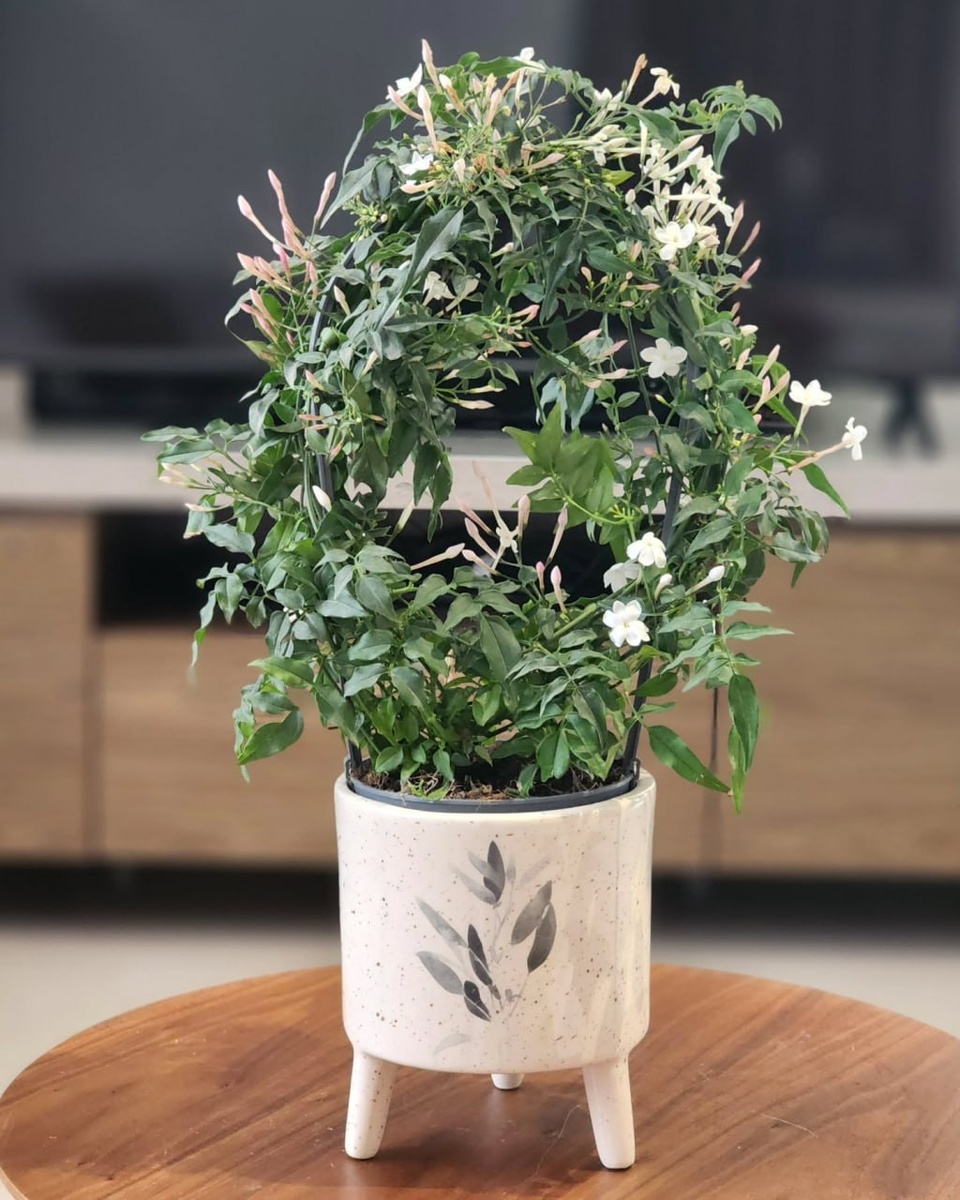 🌸 Жасмин — лиана с глянцевыми, перистыми листьями насыщенного зелёного цвета и обильными, звёздчатыми цветами в оттенках белого или розового, источающими сладкий, успокаивающий аромат, который создаёт романтический тропический шарм. Растение хорошо подходит для вертикального озеленения, ее можно пустить по опоре или шпалере. Её вьющаяся форма и нежные соцветия добавляют эстетики и минимализма. Жасмин предпочитает утреннее/ вечернее солнце, регулярный полив (после просыхания верхнего слоя почвы). Это хороший выбор для любителей растений, привносящих нежную эстетику в интерьер.