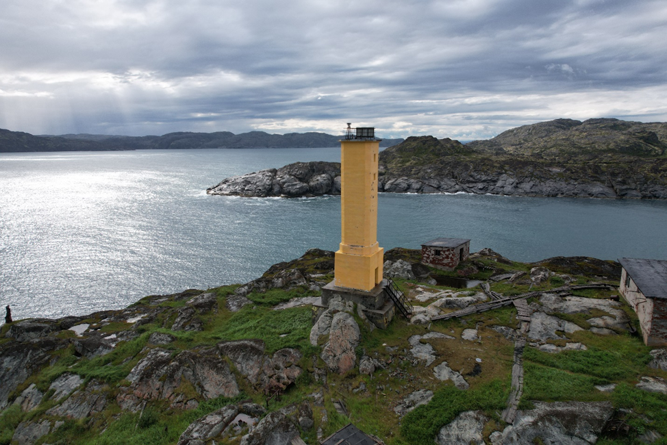 На поморском диалекте наволоком называется мыс или полуостров, выступающий в море или озеро, обычно безлесный. Кроме того, наволоком может называться участок земли, отделяющий один водоем от другого, через который надо волочить лодку. Мыс Выевнаволок находится на полуострове, отделяющем губу Ара от губы Ура в Мотовском заливе Баренцева моря. С 1925 года безопасность навигации в районе мыса обеспечивает маяк Выевнаволок. Вместе с основанием Мурманска в 1916 году и строительством Мурманского морского порта началось навигационное оборудование Кольского и Мотовского заливов. В 1925 году на мысе Выев-Наволок был установлен несветящий навигационный знак: белая четырехгранная пирамида, обшитая досками в просвет с топовой фигурой в виде двух треугольных щитов основаниями врозь на визирном шесте. Высота знака над уровнем моря составила 35 метров. Повышение интенсивности судоходства требовало установки более надежного навигационного оборудования, поэтому в 1936 году вместо несветящего знака был