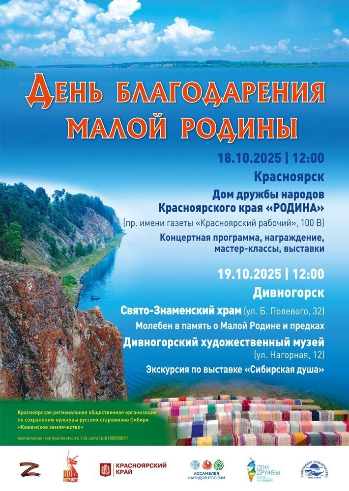 Кежемское землячество приглашает на День благодарения малой родины, который пройдёт 18–19 октября 2025 года. 18 октября в Доме дружбы народов «Родина» (пр. газеты «Красноярский рабочий», 100В) состоятся мастер‑классы, выставки, дегустация ангарских блюд и выступления фольклорных коллективов; Кежемский историко‑этнографический музей им. Ю. С. Кулаковой представит экспозицию о русском ангарском чаепитии.