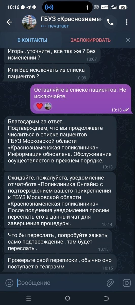 Мошенники рассылают сообщения в подложном телеграм — чате «ГБУЗ Поликлиника Краснознаменска» с предложениями подтвердить прикрепление к
