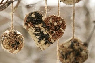 Кормушку для птичек делаем с внуком сами своими руками. Это хорошая возможность поддержать птиц в зимний период, когда трудно достать пропитание, особенно в снежный период или когда сильные морозы. Такая творческая работа может понравится вашим детям или внукам. Они будут довольны, что приняли участие в таком хорошем деле как помощь птицам. Можно повесить такую кормушку на балконе или возле окна. Вы будете видеть каждое утро как воробьи, синицы прилетают на завтрак. Самый простой способ – слепить. Вам понадобится семена: подсолнечника, пшено, лён, арбузные семечки. Чтобы их склеить можно использовать клейстер, но можно и желатин. Для этого возьмите 7 г желатина 1/4 часть стакана воды Перемешайте, дайте набухнуть и затем нагрейте, чтоб желатин растворился. Теперь расстелите пергаментную бумагу и выложите на неё формочки для печенья. Засыпьте их зерновым кормом для птичек наполовину. Положите ленточку, на которой будет висеть такая кормушка и засыпьте зерновым кормом оставшуюся полови