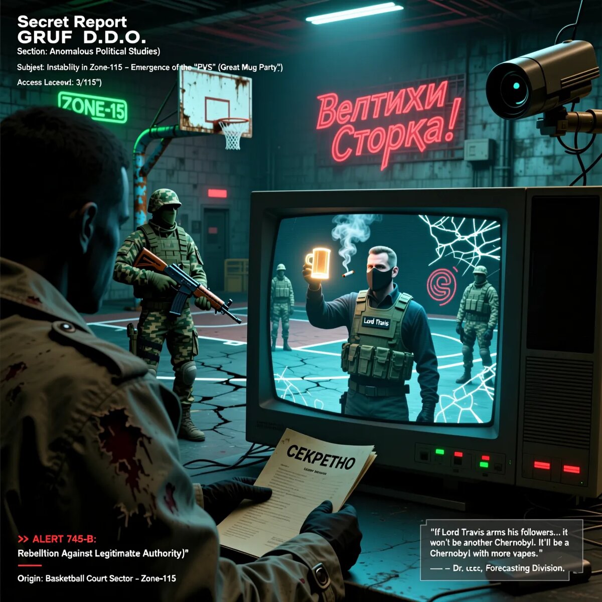СЕКРЕТНО Доклад ГРУФ D.D.O. Отдел: Аномальная политология Тема: Дестабилизация в Зоне-115. Возникновение фракции "ПВС" (Партия Великой Стопки) Уровень доступа: 3/115 --- 1. Обзор ситуации Зона-115, ранее контролируемая аномальным лидером DDO-115 ("Король Стопки"), находится в состоянии нарастающей нестабильности. Зафиксирован сигнал бедствия (код 745-B — "Мятеж против законной власти"), исходящий из района баскетбольного поля. --- 2. Новая угроза: "Партия Великой Стопки" (ПВС) Лидер: Лорд Трэвис (предположительно, псевдоним). Происхождение: Бывший "вассал" DDO-115, занимавший пост "Лорда Звëздного". Тактика ПВС: · Публичные митинги на баскетбольной площадке Зоны-115. · Открытое курение (вещества неизвестного происхождения) как символ "протеста". · Лозунги: "Долой короля-тиктока!" "Стопка должна быть великой!" Цели: · Свержение DDO-115. · Провозглашение "Великой Стопки" — аналога города-государства с "конституцией" (текст ещё не написан). --- 3. Подозрительная акти