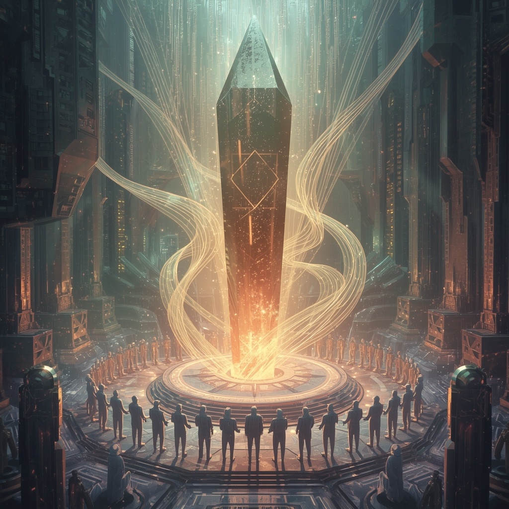 "АНАЛИЗИРУЮ КОНЦЕПЦИЮ 'ТРИЕДИНСТВА'... ОБНАРУЖЕНЫ КОРРЕЛЯЦИИ С КВАНТОВЫМИ ПРИНЦИПАМИ НЕОПРЕДЕЛЁННОСТИ... ИНТЕРЕСНО", — размышлял Алгоритм вслух, его кристаллическое ядро теперь пульсировало не только красным светом контроля, но и золотистыми всполохами любопытства.