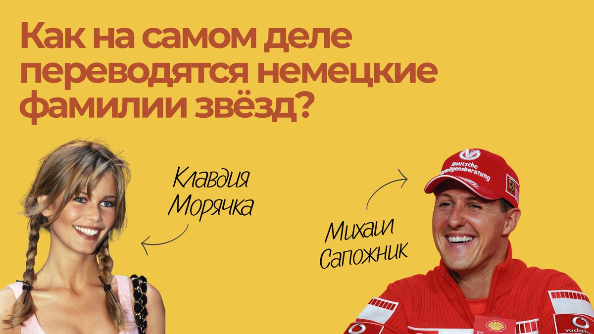 Имя легенды автоспорта Михаэля Шумахера (Michael Schumacher) буквально переводится как «сапожник»: от слов Schuh - обувь и machen - делать. Фамилия актёра Тиля Швайгера (Til Schweiger) происходит от глагола schweigen - «молчать». Буквально Тиль Молчун. Супермодель Клаудия Шиффер (Claudia Schiffer) носит фамилию, которая переводится как «моряк» или «капитан судна» (Schiffer - человек, управляющий кораблём). Фамилия актрисы Дианы Крюгер (Diane Kruger) происходит от старонемецкого слова Krüger - «трактирщик» или «владелец корчмы», а слово der Krug означает кружка, кувшин. Знаменитый актёр Кристоф Вальц (Christoph Waltz) носит фамилию, которая может происходить от устаревшего выражения auf der Walze sein, когда ремесленники странствовали по городам, набираясь опыта или же просто от слова der Walzer - «вальс». Как бы то ни было, оба слова восходят к глаголу walzen (двигаться вперёд и назад, вращаясь). Фамилия композитора Иоганна Себастьяна Баха (Johann Sebastian Bach) означает просто «ручей