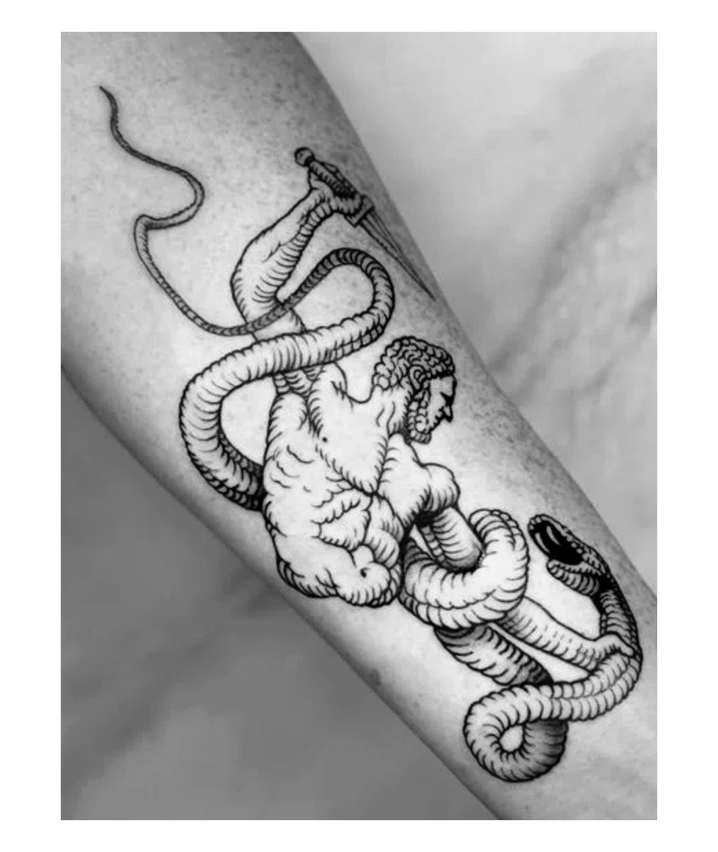 Татуировка, изображающая Геракла, сражающегося со змеями, имеет глубокое символическое значение. Она отсылает к одному из подвигов Геракла — его победе над Лернейской гидрой, многоголовой змеёй из древнегреческой мифологии. Этот подвиг символизирует борьбу с трудностями, преодоление препятствий и победу над злом. Значение татуировки: Эта татуировка подойдёт тем, кто хочет подчеркнуть свою стойкость, решительность и стремление к преодолению жизненных трудностей.
