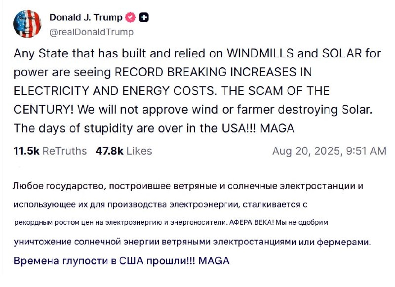 Фантомас разбушевался Президент США Дональд Трамп всё никак не оставит в покое ВИЭ. Точнее, он все ещё стоит на своём и воплощает свои предвыборные обещания электорату, большая часть из которого (как он говорит) – за использование ископаемого топлива и против возобновляемых источников. На днях, Бюро управления землями США (BLM) официально «закрыло» проект Esmeralda Solar в Неваде. Это, если что, самый большой проект солнечной энергетики в стране. Мощность – 6,2ГВт (сейчас самый большой – 1,3ГВт и он ещё не достроен). Официальная причина закрытия проекта (не анонсированного, кстати, закрытия) – экологическая экспертиза. Она была приостановлена с тех пор, как Трамп вступил в должность и сейчас BLM пытается спустить всё на тормозах. И это при том, что с момента вступления в должность, Трамп уже натыкал кучу палок в колёса ВИЭ, подписав ряд распоряжений, указов и приказов. Например: - навалил ещё пару уровней бюрократии - отменил федеральные налоговые льготы, применив к ним более строги