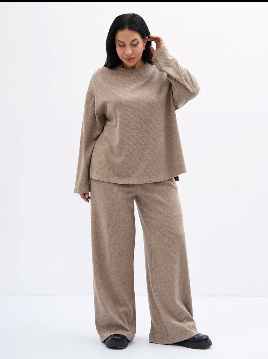 Штаны прямого кроя с широким эластичным поясом подчёркивают талию, не сковывая движения. Костюм всесезонный и универсальный — подходит и для прогулок, и для работы в офисе, и для уютных домашних вечеров.