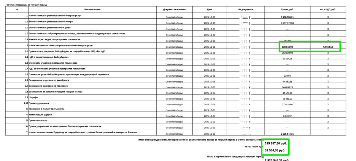 Этот пост — для тех, кто сейчас выбирает систему налогообложения или задумывается о переходе на ОСНО. Особенно если вы работаете с Wildberries, то это стоит прочитать внимательно 👇 Смотрите, в чём суть. Wildberries — это агент, а не прямой исполнитель большинства услуг. Они просто перевыставляют услуги, которые фактически выполняют службы доставки, частные ПВЗ, курьеры и сборщики. А теперь важный момент: Все эти контрагенты — обычные предприниматели, иногда даже самозанятые, и почти всегда работают без НДС! ВБ берёт расходы с нас — селлеров, а потом перевыставляет их в доход тем, кто реально оказывает услуги. И получается ситуация, как на скрине: У вас в отчёте расходы, допустим, 838 000 рублей, а НДС в зачет — всего 52 000 рублей. Хотя логично было бы ожидать около 140 000 (20%), если бы все расходы были с НДС. Многие путают строку «Вознаграждение ВБ» с комиссией ВБ. А это не одно и то же. В эту статью входит: А вот на рекламу идёт отдельная УПД — и там НДС учитывается корректно. По