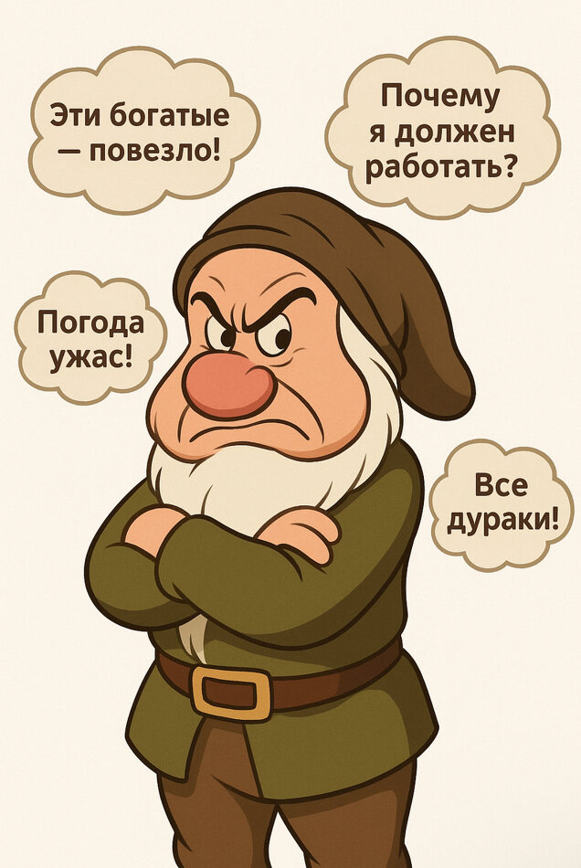 • Почему некоторые люди вечно всем недовольны Наверняка вы встречали таких людей. Кто-то рядом постоянно бурчит:— Эти богатые — просто повезло.— Худая? Да у неё гены.— На работе опять требуют работать — совсем обнаглели!— Погода плохая, страна ужасная, люди глупые, жизнь несправедливая. Кажется, будто мир специально создан, чтобы раздражать их. Но за этим ворчанием чаще всего стоит не злость, а боль. Та самая, которую человек не хочет признавать — боль от чувства собственной несостоятельности, бессилия, страха не справиться. • Откуда берётся вечное недовольство С точки зрения когнитивно-поведенческой терапии (КПТ), мы реагируем не на саму ситуацию, а на мысли, которые о ней думаем.Если внутри живёт установка «со мной что-то не так» или «все лучше меня», то мир постоянно подкидывает доказательства.Коллегу повысили — «подлиза».Подруга купила квартиру — «повезло, у меня бы не вышло».Кто-то похудел — «наверное, просто гены». Так формируется привычный сценарий: принижать успехи других, чтоб