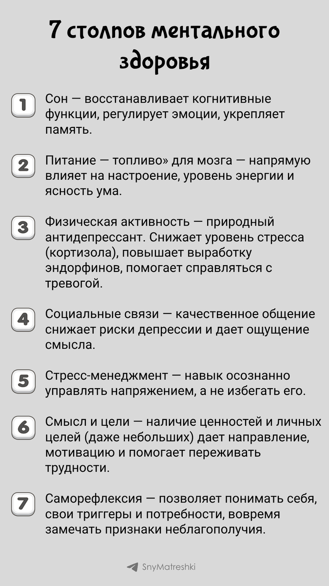 Это основа, на которую стоит опираться для поддержания психологического благополучия. Пренебрежение даже одним «столпом» может повлиять на общую устойчивость. Эти столпы взаимосвязаны. Плохой сон повышает стресс, несбалансированное питание лишает энергии, а отсутствие связей подрывает чувство смысла. Работа над одним из них положительно влияет на все остальные. Поддержать автора Александра Бóгдан,