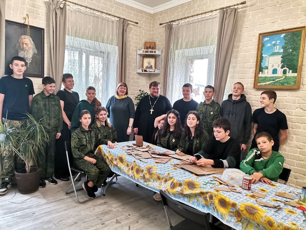 Благочинный Малинского церковного округа иерей Алексий Плужников рассказал о святителе Тихоне, Патриархе Московском и всея России, осветив его служение в историческом контексте эпохи и отметив важность сохранения памяти о нём в год 100-летия со дня его преставления. В здании воскресной школы кадеты изготовили партию «окопных» свечей, которые будут отправлены на фронт. В завершение встречи отец Алексий подарил каждому ученику по баночке меда.