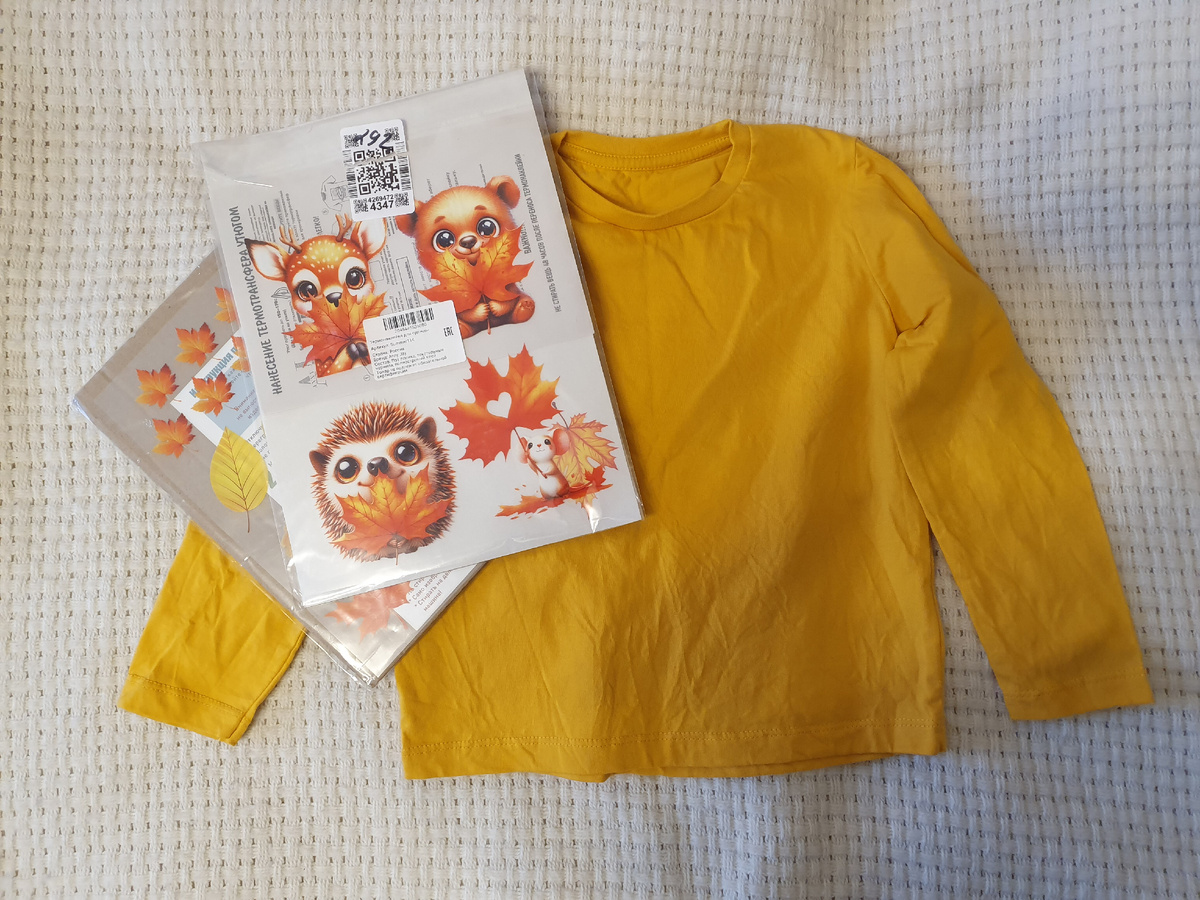 В пятницу у Сани в садике был День осени. Что-то вроде утренника небольшого, но без родителей. Воспитатели просили детей одеть в одежду осенних цветов или добавить какие-то аксессуары на тему осени. Я заказала Сане горчичный лонгслив без картинок и термонаклейки. Картинку Саня сам выбирал. Я была за медведя, но он захотел оленя.