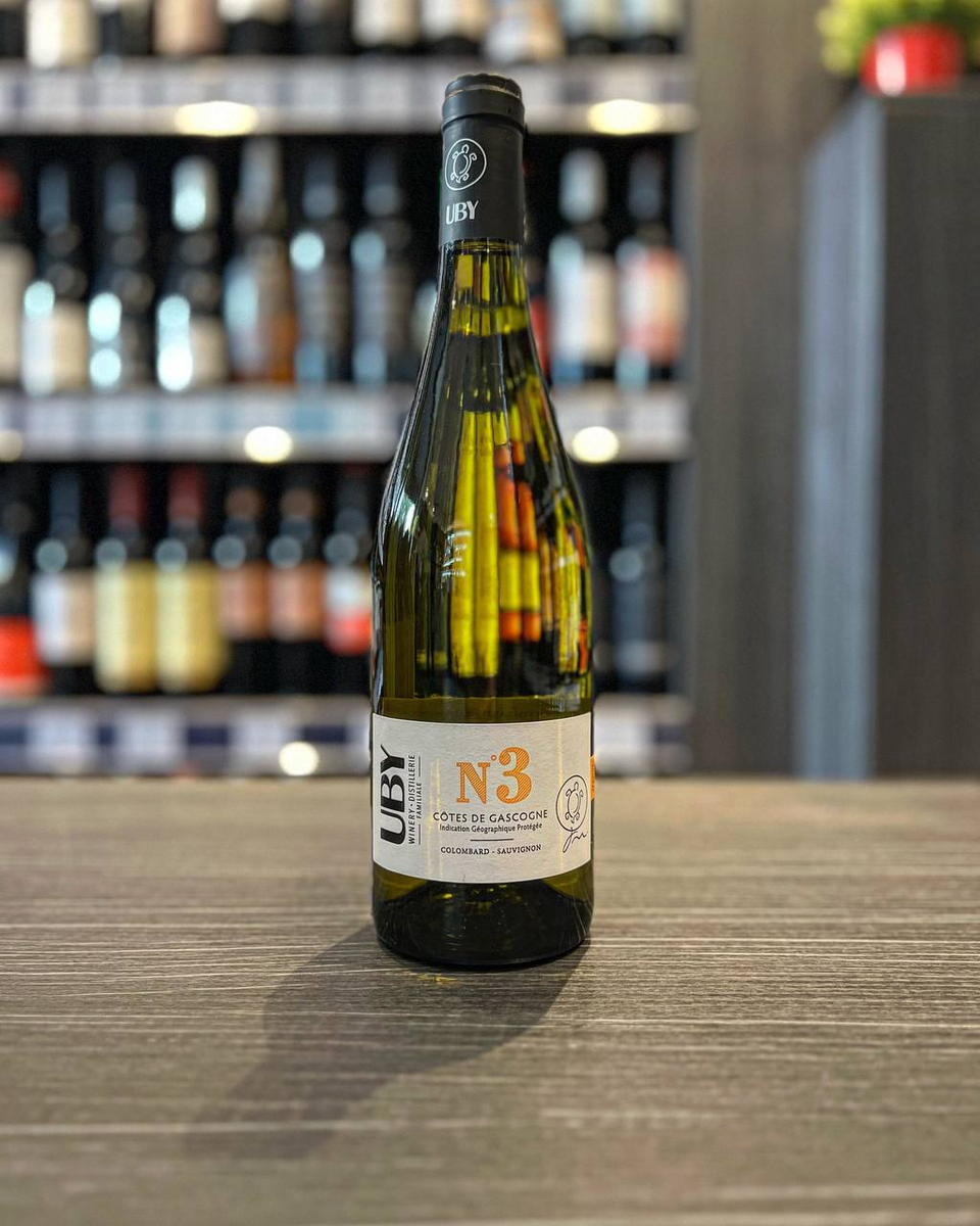 Белое сухое французское вино "Uby" №3 изготовлено из винограда сортов Коломбар и Совиньон Блан, которые выращиваются в регионе Кот де Гасконь.