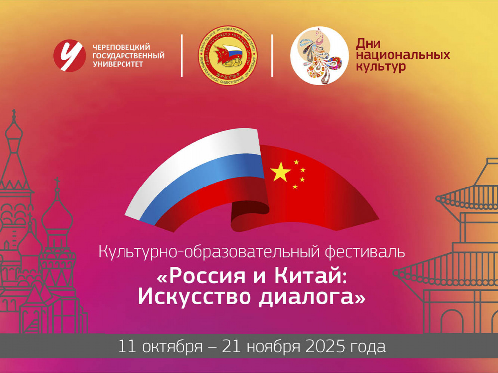 Череповецкий государственный университет и Вологодское отделение «Общества российско-китайской дружбы» вместе с проектом «Дни национальных культур» представляют программу мероприятий для развития культурных, образовательных и гуманитарных связей между Россией и Китаем. С 11 октября по 21 ноября 2025 года в Череповце проходит культурно-образовательный фестиваль «Россия и Китай: Искусство диалога». В ходе фестиваля жителей и гостей города ждёт насыщенная программа, включающая выставки, мастер-классы, научные конференции, лекции, дискуссии, интерактивные игры и творческие встречи. Среди ключевых событий фестиваля: Фестиваль адресован широкой аудитории – от школьников и студентов до взрослых ценителей культуры и международного диалога. Мероприятия проходят на различных площадках города: в «Точке кипения» ЧГУ, арт-пространстве «Петров Ям», библиотеках, Передовой инженерной школе при ЧГУ и культурных центрах. Организаторы фестиваля стремятся не только познакомить участников с богатым культур