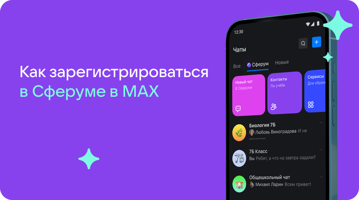 Создайте профиль в новом мессенджере, чтобы не пропустить важную информацию от педагога в Сферуме. Шаг 1. Найдите MAX Приложение есть в App Store, Google Play, RuStore и App Gallery. Ищите его по названию «МАХ мессенджер». Шаг 2. Установите MAX на свой телефон Новый мессенджер простой и лёгкий, поэтому быстро установится и займёт совсем немного места. Если вы планируете пользоваться мессенджером на компьютере, версии для Windows, macOS и Linux можно скачать с официального сайта max.ru Кроме того, есть и веб-версия. Вы можете использовать MAX в привычном вам браузере по ссылке web.max.ru 1. Введите номер телефона Используйте тот же номер телефона, который привязан к профилю Сферума. Это поможет перенести учебные чаты в MAX. 2. Подтвердите его кодом из СМС Если сообщение задерживается, проверьте, правильно ли указан номер, или нажмите «Отправить код повторно». 3. Укажите имя и фамилию Важно использовать настоящее имя, так как его будут видеть администраторы школы, учителя и родители.