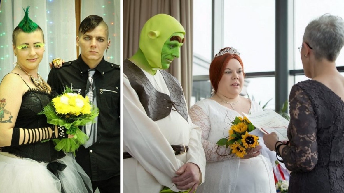 Каждая хочет, чтобы ее свадьба была самой-самой. И как раз вот это чувство конкуренции подводит дам, особенно если у них нет вкуса. Свадьба уже давно перестала быть традиционным торжеством, и тут уже кто на что горазд: в норму вошли тематические церемонии, косплей в качестве свадебных нарядов, бракосочетание в кроссовках и многое другое. Некоторые превзошли сами себя и создали такие свадебные образы, что их теперь обсуждает весь интернет. И вряд ли это та популярность, которую они искали. Это вообще странно. Как кому-то пришла в голову идея делать свадьбу в стиле мультфильма про зеленого огра? Тем не менее, задумку поддержала не одна пара, что вы можете видеть на фотографиях. Для косплея образы круты, но не для главного торжества жизни. Если уж и собрались организовывать мероприятие в стиле культового сериала, то пусть это будет качественно. Иначе получится нелепица даже на фотографиях, не говоря уже о реальности. Здесь персонажи решили ограничиться дешевыми костюмами и нелепым игруше