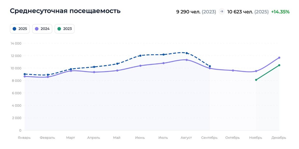 🔥 Рост посещаемости ТЦ «Зеленый берег» В первые три квартала 2025 г. среднесуточная посещаемость ТЦ «Зеленый берег» (фонд А-19) выросла на 8% (по сравнению с аналогичным периодом 2024 г.). Пик посещаемости пришелся на весну и лето. Рост связан с несколькими факторами, в том числе с вводом в эксплуатацию новых домов в пешей доступности (якорные арендаторы ТЦ — продуктовая сеть «Лента» и гипермаркет товаров для дома Hoff). Среднесуточная посещаемость, а также другие отчеты в формате дашборда представлены в микросервисе «Дельта». #А19