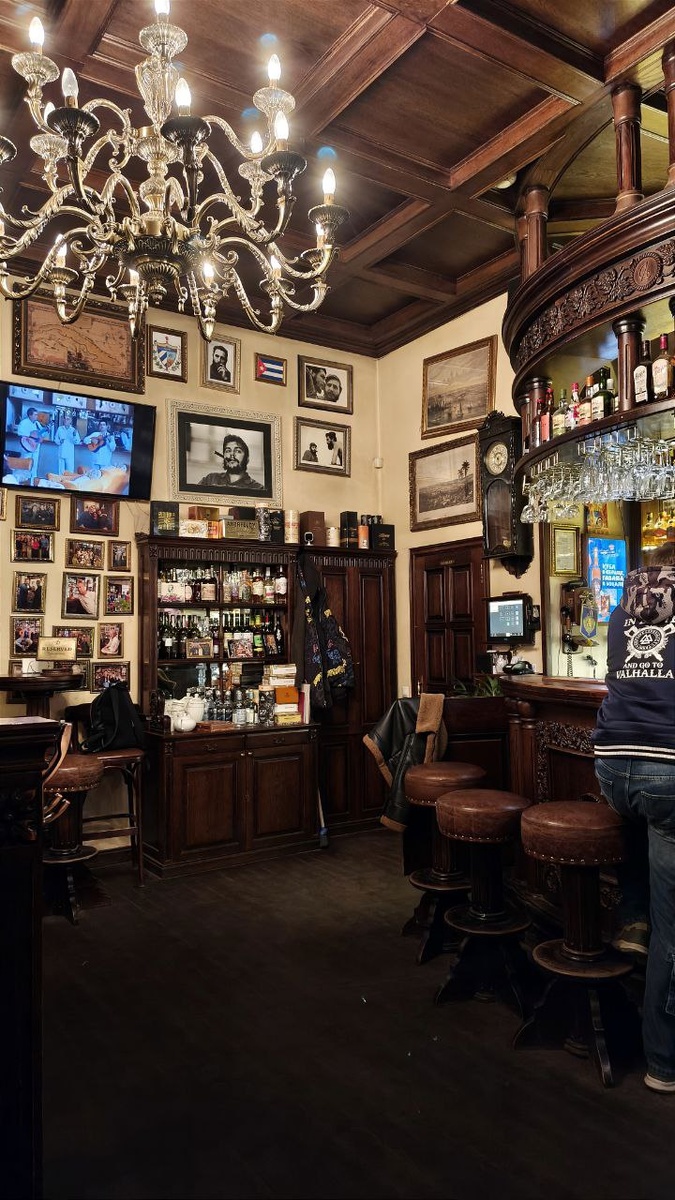 Атмосфера кафе напоминает тихую гавань с спокойствием и роскошью. Тёплый свет старинных ламп подчёркивает отделку из натурального дерева. Деревянные панели и мебель из ценных пород дерева создают элегантность и комфорт. На барной стойке — коллекция кубинского рома. Мягкие кожаные диваны, приглушённая музыка джаза создают ощущение тепла и интимности. В кафе можно насладиться ромом, деревянной отделкой, мягкой кожей и музыкой.