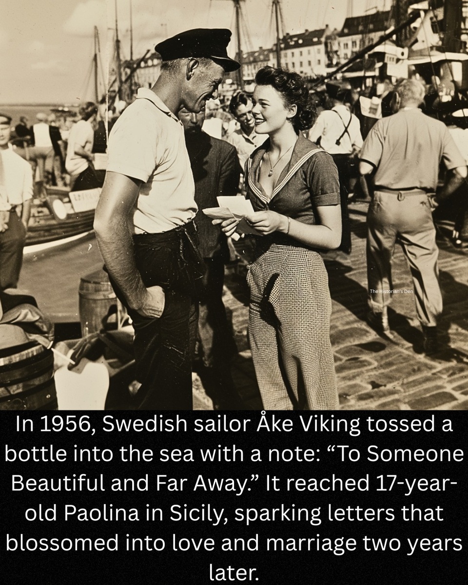 В 1956 году шведский моряк Оке Викинг (Åke Viking) бросил бутылку в Атлантический океан с запиской: “To Someone Beautiful and Far Away” («Кому-то прекрасному и далекому»). Он был один на своем корабле и надеялся, что кто-нибудь найдет его послание. Оке, любивший поэзию, не ждал ответа. Он отправил бутылку, не имея ни малейшего представления о том, куда она отправится. Несколько недель спустя брошенная бутылка... доплыла до Сицилии. Паолина, 17-летняя девушка, нашла ее, прогуливаясь недалеко от своего городка Мадзара-дель-Валло (Mazara del Vallo). Она прочитала записку и была тронута ее словами. Она написала Оке, делясь подробностями своей жизни: об апельсиновой роще своей семьи и рыбацких лодках в ее городке. Оке и Паолина переписывались два года. Они делились историями о своих домах, холодных шведских морях Оке и солнечной сицилийской деревне Паолины. Их письма стали крепкой связью, несмотря на то, что они жили далеко друг от друга. Они узнали друг о друге больше и прониклись глубокой
