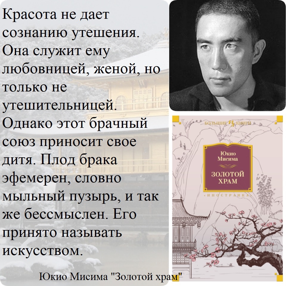 Не уверена, что смогла до конца понять, что Юкио Мисима вкладывал в свой роман: для этого надо родиться японцем, разбираться в синтоистских и буддистских категориях и истории страны. Та же категория Пустоты (Шуньяты) считается непростой для понимания и среди самих буддистов. Да и перечитать книгу тоже не помешает: там еще есть о чем поговорить. Мисима ставит перед читателем множество вопросов: что есть Прекрасное и его отражение в архитектуре, музыке, человеческом теле; соотношение внешнего и внутреннего, сознания и деяния, жизни и смерти...