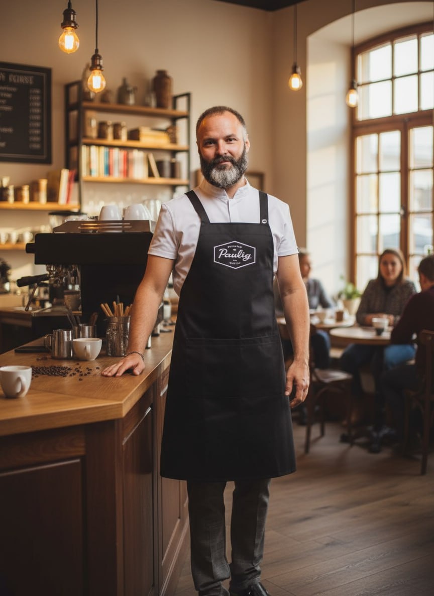 Финал. Когда владелец готовые фартуки увидел, глаза загорелись: "Теперь мои бариста как настоящая команда выглядят!"