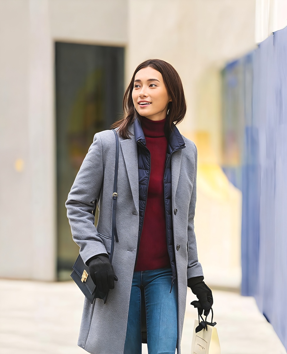Третий момент — открытые зоны. Даже в самый сильный мороз важно оставить что-то открытым: либо запястья, либо шею. Если надеваете водолазку с высоким воротом, подверните рукава или выберите длину три четверти. Если воротник низкий, можно закрыть руки полностью. Такой подход не даёт образу выглядеть перегруженным, и лицо кажется свежее.