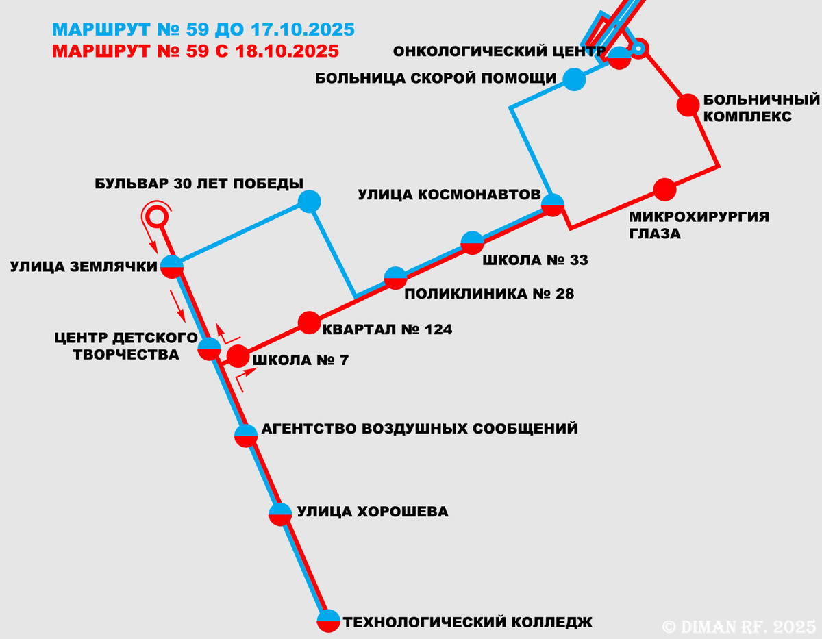 На официальном сайте Администрации Волгограда размещена новость об изменении с 18 октября 2025 года маршрута автобуса № 59. Увы, департамент городского хозяйства не посчитал нужным опубликовать постановление о внесении изменений в официальный реестр муниципальных маршрутов регулярных перевозок, поэтому будем опираться на текст новости. В настоящее время по Дзержинскому району маршрут № 59 следует следующим образом. В сторону Спартановки с конечной остановки: В сторону Технологического колледжа по Третьей Продольной магистрали и далее через остановки: Предполагается полностью изменить схему движения маршрута № 59 по микрорайону Семь Ветров, чтобы задействовать две новые остановки общественного транспорта на новой части улицы Константина Симонова. В сторону Спартановки с конечной остановки: В сторону Технологического колледжа по Третьей Продольной магистрали и далее через остановки: Таким образом в обе стороны выпадает ряд остановок по улице Землячки. В сторону Краснооктябрьского района