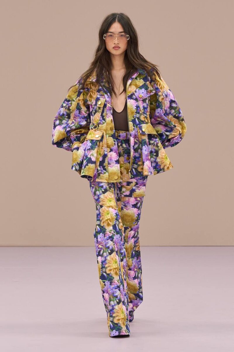 Цветочный бум тренд сезона весна лето 2026 Цветочные композиции в этом сезоне были какими угодно, но только не нежными. Яркие по гамме, насыщенные по цвету и часто контрастирующие с полосами или клетками, они утратили всякую утонченность. На всех подиумах - от Chloé до Gucci, от Zimmermann до Miu Miu — коллекции blooms отличались максимализмом. Кто-то предпочитал китч, кто-то ностальгию, но ни одна из них не была тихой. Были и кислотно-яркие маргаритки, и ретро-принты на обоях, и огромные лепестки, наложенные друг на друга без ограничений. Речь шла не о романтике, а о эффекте. Правило? Если это выглядит чересчур, значит, вы все делаете правильно.