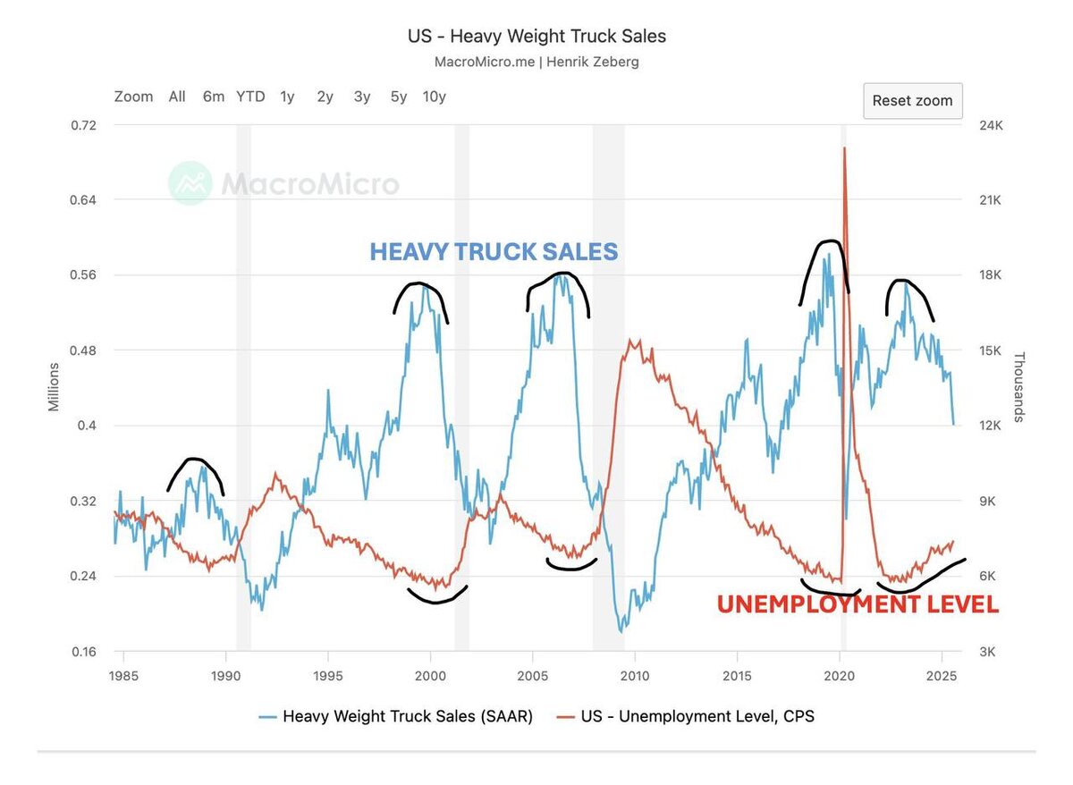 Финансовый мир живёт в опросах — реальный в грузовиках В финансовом мире всё измеряют анкетами. Вот, например, «Senior Loan Officer Survey»: процент банков, где офицеры считают, что спрос на кредиты растёт. То есть опрос людей, которые… предполагают настроение своих клиентов. С лагом. По ощущениям. Это тот случай, когда ты спрашиваешь штурмана, куда летит самолёт, а он отвечает: «Ну, вроде вверх. По моим ощущениям». А теперь — реальный мир. Продажи тяжёлых грузовиков. Если они падают — бизнес перестаёт расширяться, снижается транспортировка, склады заполняются. Через несколько месяцев за этим следует рост безработицы. Всегда. Не потому что кто-то «ожидает рецессию». А потому что реальная экономика уже тормозит. Финансовый мир смотрит на ожидания — реальный на движение колёс. И если колёса замедляются, никакая риторика ФРС не спасёт. Так что выбирайте, кому верить — аналитикам из опросов или дальнобойщикам, которые видят рынок своими глазами. #макроанализ #экономика #рынок #цикл