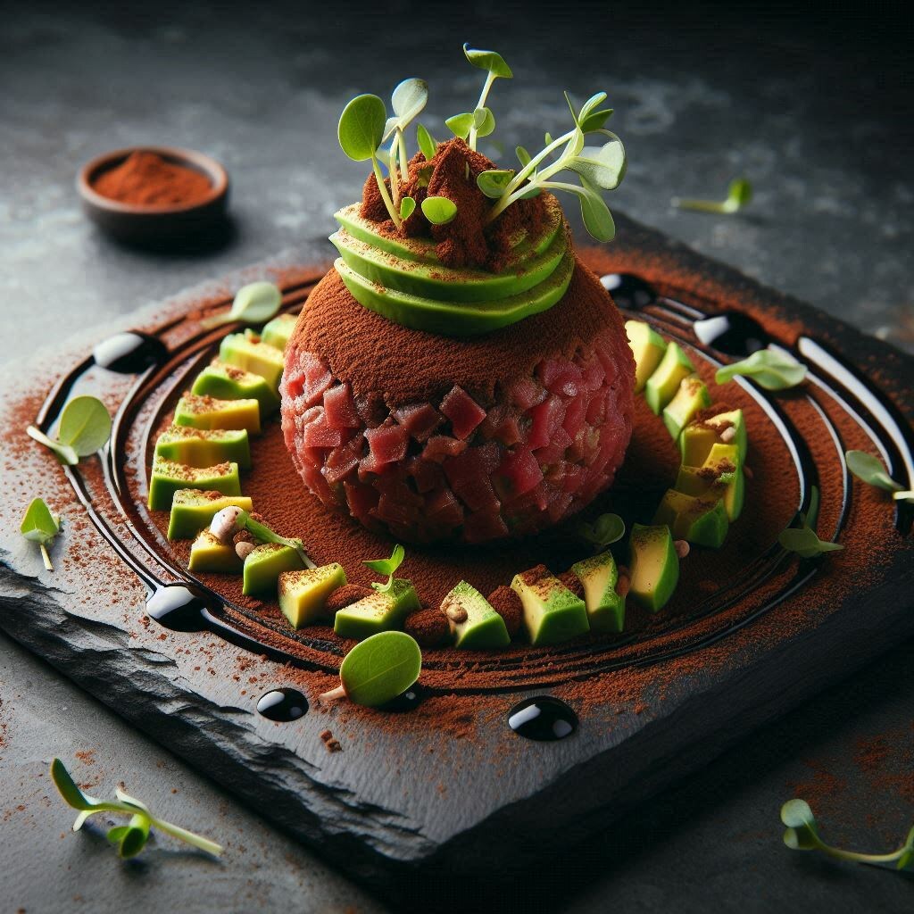 1. Рыбный "шоколад" из тунца (тартар с авокадо и какао) 🍫