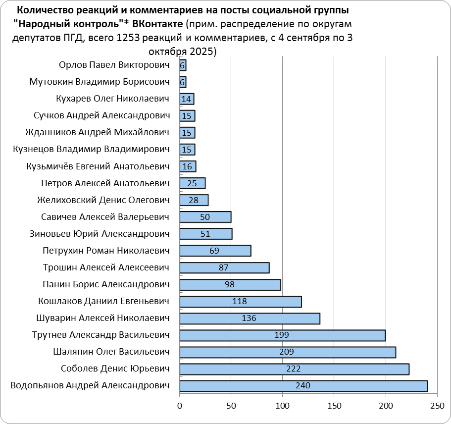 В период с 4 сентября по 3 октября 2025 года осуществлен мониторинг группы «Спроси у Власти | Народный контроль | Пенза» (далее: «Народный контроль») в социальной сети ВКонтакте. Анализу подверглись 62 поста, опубликованных в период с 1 по 30 сентября 2025 года. По каждому посту фиксировались количественные показатели (количество реакций, комментариев, просмотров) спустя 72 часа после публикации, адресная привязка проблемы, ссылка на пост и краткое описание сути обращения. Проблематика классифицирована в соответствии с действующими по решению Президента Национальными проектами России. Информация о закрепленности адреса проблемы за конкретным одномандатным округом и депутатом Пензенской городской Думы получена посредством поиска по адресу на официальном сайте Думы.