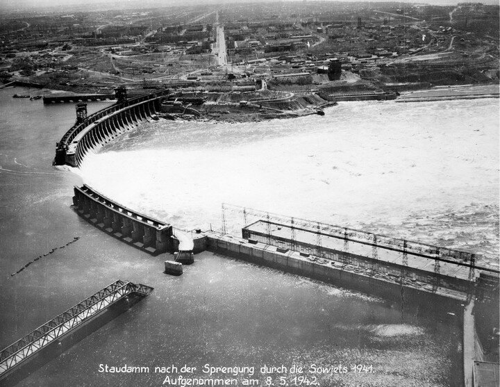 Впрочем, это лишь теория. На практике же есть масса немецких фото, на которых никаких разрушений не видно. А самое интересное, что остров Хортица — который вроде как первый под удар попадает, вообще не был затоплен и на нём шли активные боевые действия.