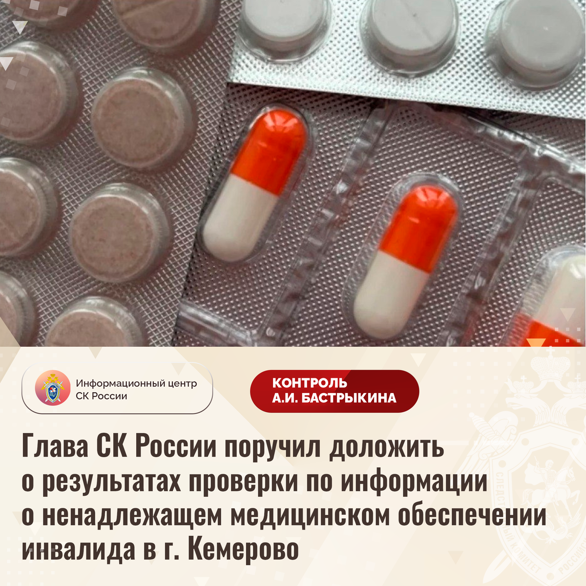 Глава СК России поручил доложить о результатах проверки по информации о ненадлежащем медицинском обеспечении инвалида в г. Кемерово В СМИ сообщается о нарушении прав жительницы города Кемерово, являющейся инвалидом, на качественное медицинское обеспечение. Пожилая женщина, страдающая сердечно-сосудистым заболеванием, после проведенного оперативного вмешательства нуждается в приеме льготного препарата, который более месяца ей не выдается. Родственникам предлагается приобрести медикамент за свой счет, что для них финансово затруднительно. Обращения в различные инстанции результатов не принесли. В СУ СК России по Кемеровской области – Кузбассу организована процессуальная проверка. Председатель Следственного комитета Российской Федерации Александр Иванович Бастрыкин поручил и.о. руководителя СУ СК России по Кемеровской области – Кузбассу Павлу Васильевичу Курочкину доложить о промежуточных результатах процессуальной проверки и принятом по итогам решении. Исполнение поручения, а также ход