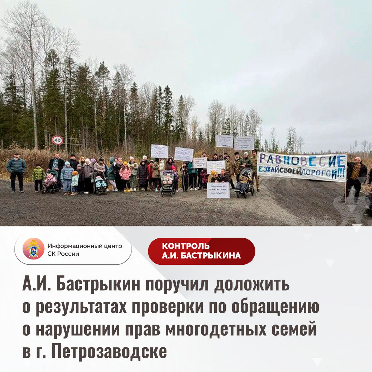 А.И. Бастрыкин поручил доложить о результатах проверки по обращению о нарушении прав многодетных семей в г. Петрозаводске В телеграм-канале размещено видеообращение жителей города Петрозаводска, среди которых семьи с детьми-инвалидами и многодетные семьи, по вопросу нарушения их прав. В 2014 году гражданам льготной категории предоставлены земельные участки в квартале Резервном без надлежащей инфраструктуры. Жители за свой счет провели необходимые коммуникации и отсыпали грунтовую дорогу, которая в настоящее время находится в непригодном состоянии из-за регулярного движения по ней грузовых автомобилей. Многочисленные обращения в компетентные органы результатов не принесли, семьям отказано в асфальтировании всей протяженности дорожного полотна и строительстве тротуаров. В СУ СК России по Республике Карелии организована процессуальная проверка. Председатель Следственного комитета Российской Федерации Александр Иванович Бастрыкин поручил и.о. руководителя СУ СК России по Республике Карели