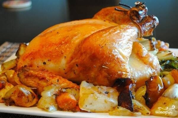 Разогрейте духовку до 220 °С. Начините курицу яблоками с луком, зашейте брюшко или заколите предварительно замоченными в воде на 30 минут шпажками. Положите курицу грудкой вниз в застеленную пергаментом форму и поставьте в нижнюю треть духовки на 10 минут. Уменьшите температуру духовки до 120 °С, смажьте курицу простоквашей и запекайте 1,5, смазывая простоквашей блюдо 15 минут. За 20 минут до готовности переверните курицу грудкой вверх. Перед подачей дайте курице полежать на блюде под листом пергамента 10 минут. Затем достаньте нитки или деревянные шпажки, аккуратно выньте начинку, разделите курицу на порции и подайте с начинкой.