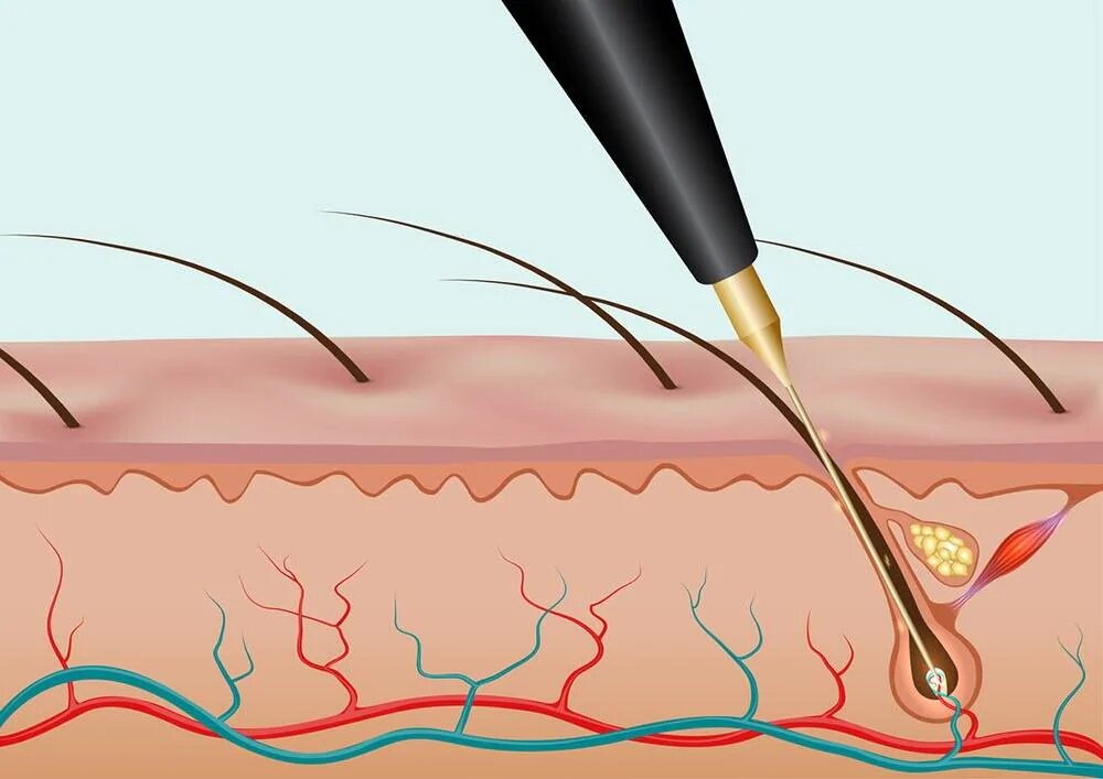 Электроэпиляция — это метод, при котором каждый волосяной фолликул разрушается индивидуально с помощью тонкой иглы-электрода. Через эту иглу в фолликул подается слабый электрический разряд, который вызывает химическую реакцию или тепловое воздействие, разрушающее клетки, ответственные за рост волоса. Это единственный метод, официально признанный FDA (Управлением по контролю качества пищевых продуктов и медикаментов США) как способ перманентного удаления волос.