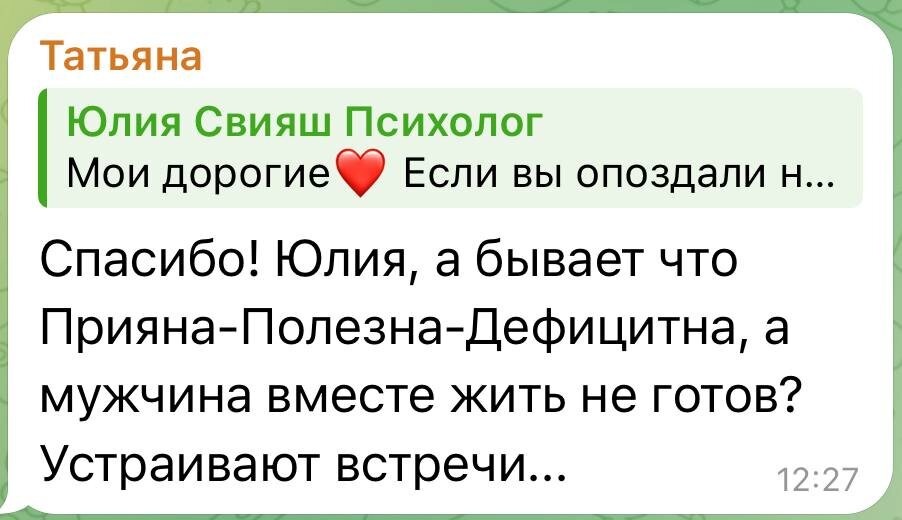 Не будем больше испытывать ваше терпение, дорогие читательницы. Разбор подвезли 😁. ДАНО: ✅ мужчина приятный, одна штука и ✅ встречи взаимно приятные несколько штук, но ✅ между встречами режим - хз что происходит, поэтому ✅ вы решаете ребус, кто тут из двоих тормозит, пока ✅ не хотите быть категоричной в выводах и действиях, однако ✅ вас все больше занимает вопрос - кто я для тебя Куда посмотреть? 1️⃣ Почему вы не проясняете ситуацию, если вам уже некомфортно в ней находиться? 💔Страшно спугнуть, опередить события 💔Страшно показаться зависимой, просящей 💔Страшно получить ответ и оказаться не только с развитым сердечком, но и в дурочках. На самом деле, у вас нет способа, после которого вы будете в своих и в его глазах выглядеть хорошо и красиво. Вы боитесь собственных чувств, с которыми вы столкнетесь в результате этого разговора. Ну и цена вопроса страшна, да. Поэтому в аптечке КТО Я ДЛЯ ТЕБЯ https://s.jsviyash.com/lp/nJP3TTK0 есть все, чтобы без гаданий на кофейной гуще выяснить и о