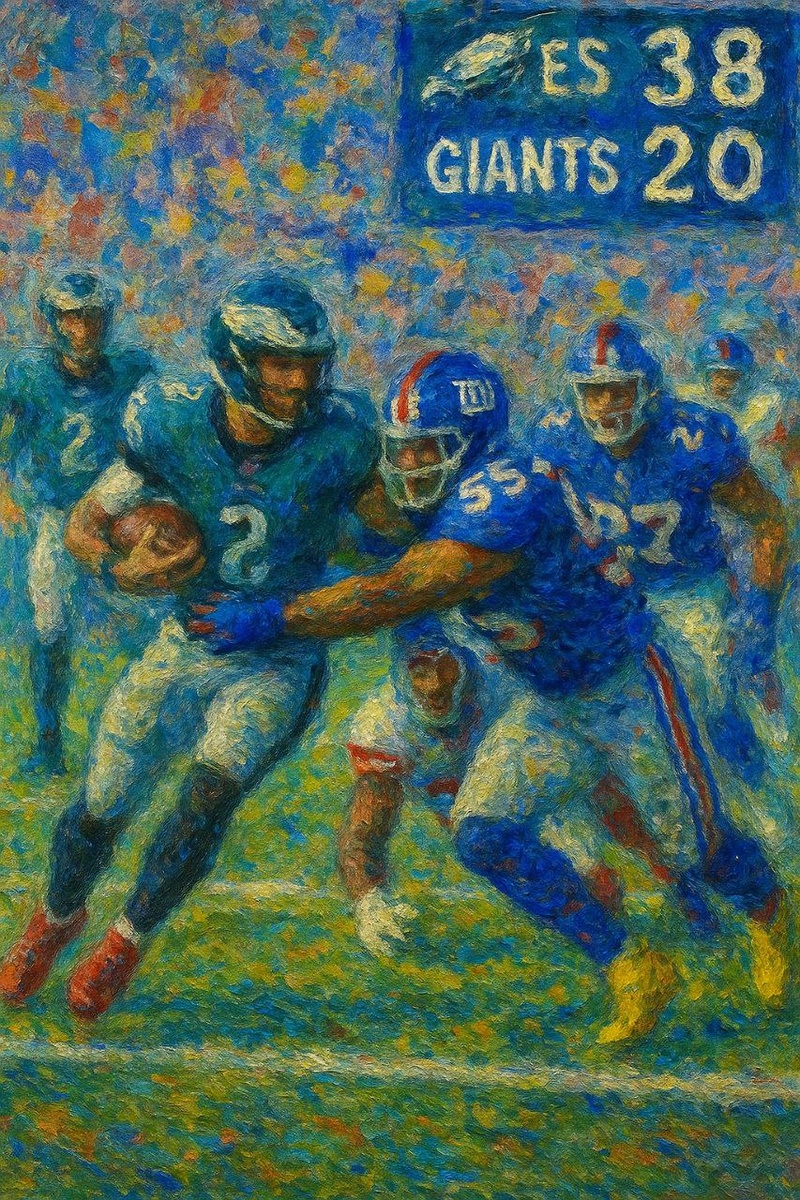 Для команды всего с двумя победами в сезоне Джайентс были весьма неплохи против действующих чемпионов Иглз. Но разница в классе существенна - преимущество Филадельфии почти двукратное - 38:20 В стиле импрессионистов