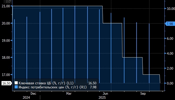 Прогнозный уровень ставки ЦБ РФ к концу 2025г - 16,5% - "АКБФ" Прогнозный уровень ключевой ставки Банка России к концу текущего года составляет 16,5% годовых, сообщается в материале аналитиков инвестиционной компании "АКБФ". "Полагаем, что реализовать смягчение кредитных условий в ноябре или декабре 2025 года регулятору будет сложнее ввиду возможного нарастания сезонных проинфляционных факторов, с учетом ожидаемого эффекта со стороны роста НДС, тарифов и ряда других факторов, обусловленных влиянием принятого в первом чтении проекта федерального бюджета на 2026 год и плановый период 2027-2028 годов, - пишут эксперты. - Данная ситуация существенно формирует риск для наших кратко- и среднесрочных прогнозов. На этом фоне к концу 2025 года ожидаем значение ключевой ставки на отметке 16,5% против 16% ранее". Аналитики также указывают, что в рамках базового сценария (с учетом обозначенных выше макроэкономических рисков), принимая во внимание ожидаемый постепенный рост потенциальных оценочных