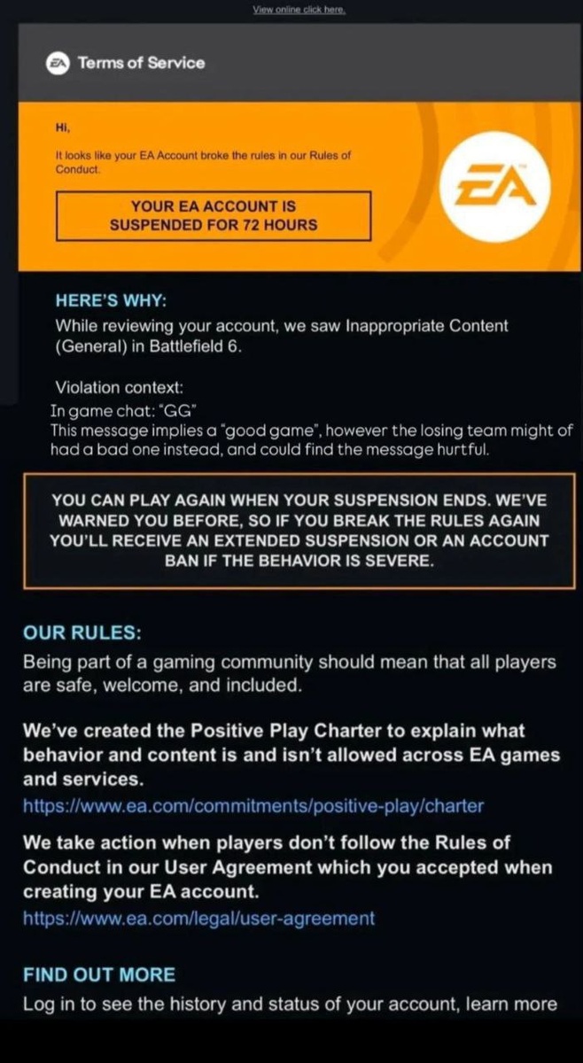 В Battlefield 6 аккаунт остранили от игры за сообщение «GG» в чате. Поддержка ЕА посчитала, что сообщение «Хорошая игра» может быть оскорбительными для проигравшей команды, у которой игра могла быть плохой. Добро пожаловать в дурку. CtrlAltDelights- подписаться