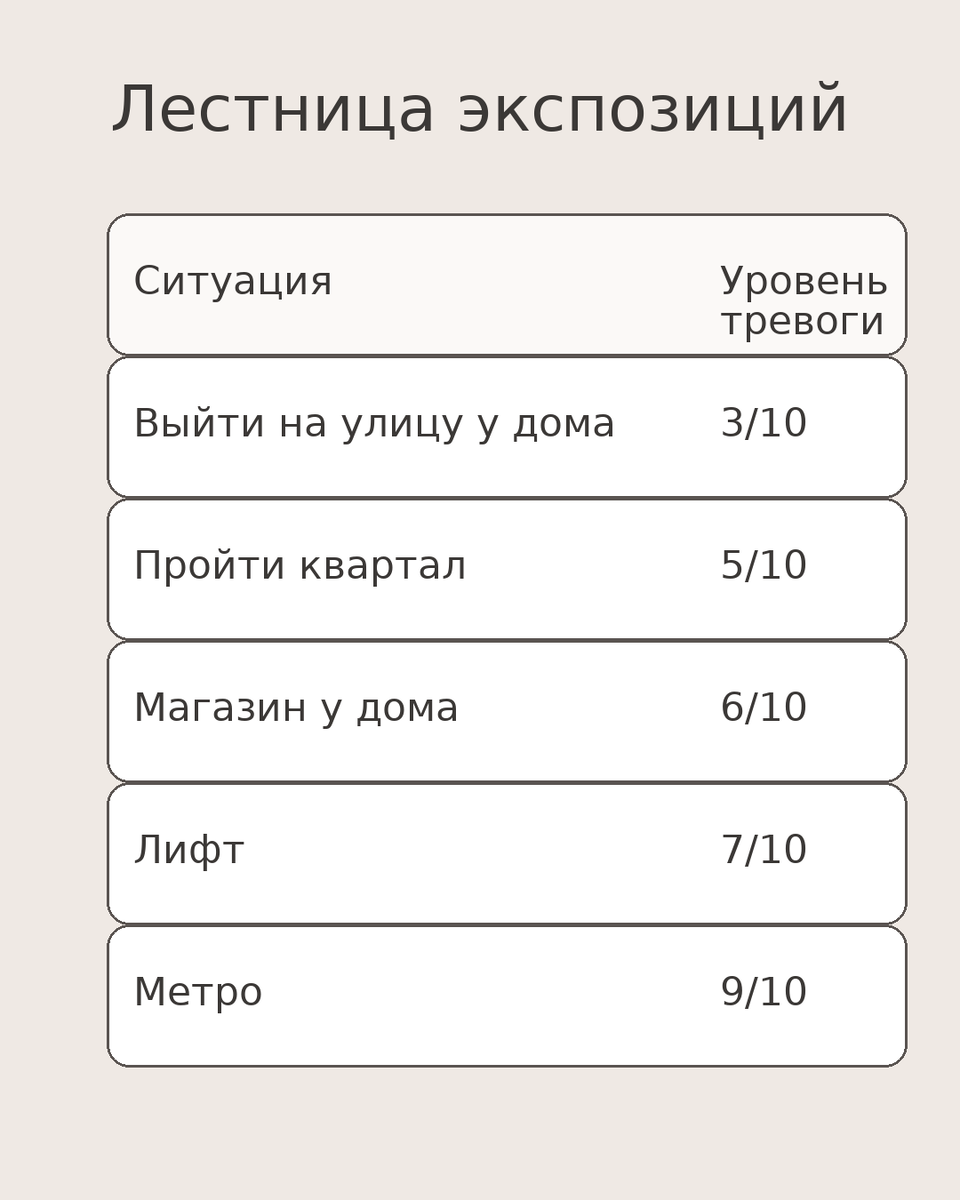 Симптом → Замечаю → Дышу → Остаюсь → Страх уменьшается Пример: По шкале от 1 до 10. Например: Например: Цель — оставаться, несмотря на тревогу, чтобы мозг понял: «опасности нет». Если уйти на пике — мозг «подтвердит», что там опасно. Это занимает 2–7 минут, иногда чуть дольше — и это нормально. Экспозиции — это не героизм и не ломка через силу.