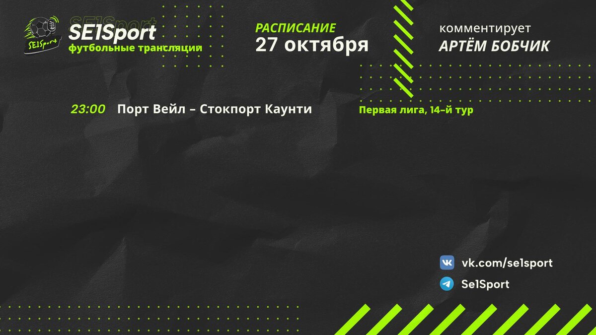 ⚽ Первая лига (League One), 14-й тур 📅 27 октября 2025 🕚 23:00 (мск) 🏟️ Порт Вейл — Стокпорт Каунти “Порт Вейл” снова буксует — после короткого всплеска команда ушла в штопор: три матча без побед, а в прошлом туре умудрилась уступить “Уигану”, который целый тайм играл в меньшинстве (0:1). “Стокпорт”, наоборот, в отличной форме и постепенно подбирается к лидерам. Турнирная таблица подсказывает, что гости фавориты, но в родных стенах “Вейл” способен удивить кого угодно. 🔥 Интрига простая: удастся ли хозяевам прервать затяжную серию неудач — или “Стокпорт” продолжит марш к вершине?